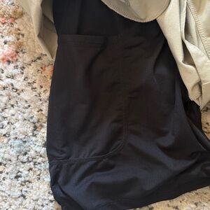 Fabletics beige shorts with a black drawstring. Perfect for the gym or a run. To side pockets and thigh cell phone pocket. Size large. Tag has been removed.