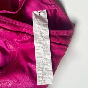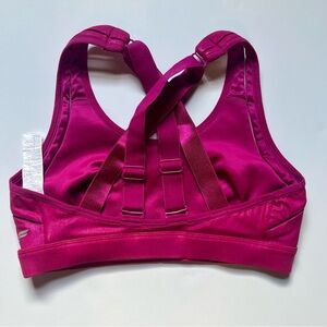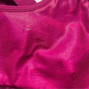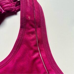 High support sports bra in iridescent pink. Size small. Straps are hook and eye, allowing some modification for the best fit. Space for pads but no pads included. Please note a couple of spots on the bra that are silver. They are clearly visible in the photos.