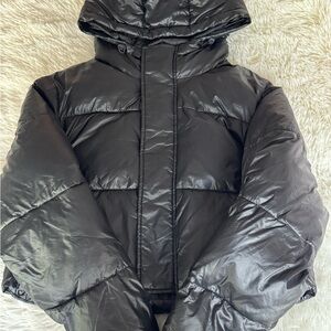 Stylish black puffer jacket with a hood. Perfect for cold weather.