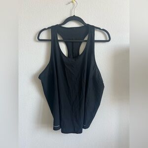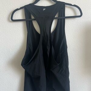 Sleek black tank top with racerback design. Ideal for workouts or casual wear.