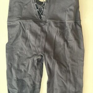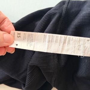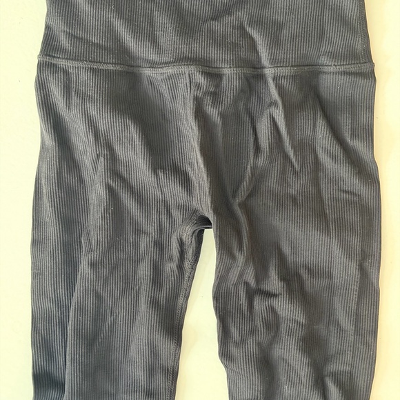 Sleek ribbed leggings from Fabletics in classic black with cross detail in the back for extra stretch, strong hold. Ideal for workouts or casual outings.