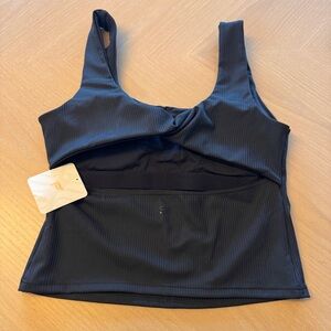 Sleek ribbed tank with open twist back cutout. Stretch fabric for a snug, comfortable fit. Minimalist design that layers easily. Smooth finish and clean lines for versatile wear.