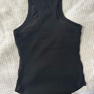Chic black ribbed tank top. Ideal for versatile styling or athletics. Comfortable and stylish. Has a built in sports bra.