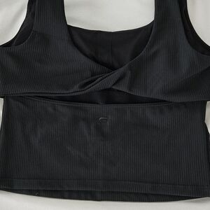 Stylish black ribbed twist back cutout tank top. Built in bra support with padding. Brand new, tags removed. From Fabletics, size Large.