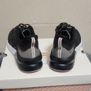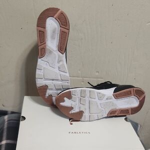 Stylish Fabletics sneakers. Black upper with pink accents. Comfortable and trendy design. Worn twice short time. Normal wear at bottom but still look brand new. I wouldn't reccomend for a wider foot