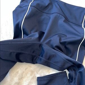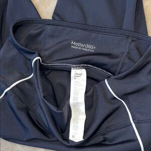 Experience the perfect blend of style and functionality with these Fabletics leggings. Featuring a sleek black design with white piping that follows an ergonomic line, these leggings are crafted from a stretchy material ideal for active pursuits. Ending at mid-calf, they offer both comfort and a modern athletic look.
