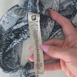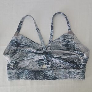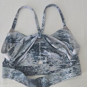 Chic and supportive sports bra. Features a unique blue pattern. Ideal for workouts.