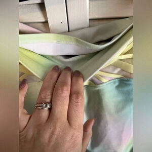 Fabletics leggings in good shape still. Does have some slight piling but nothing too bad. No stains that I could find. The colors are so pretty. It does have a back pocket on the lower back. Inner thigh area is still in great shape too. Please make sure to inspect the pics but def let me know if you wanna see anything closer. Comes from a smoke free pet friendly home.