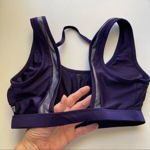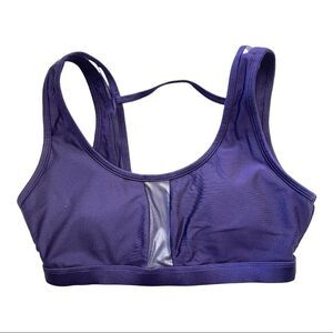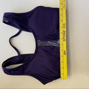 What I Love About It: Deep purple-y blue in color. Mesh strip in front and open back. Front has padding that is not removable. Size tag is missing so check the measurement photo. Let me know if you need other measurements. This sports bra is in near new condition.