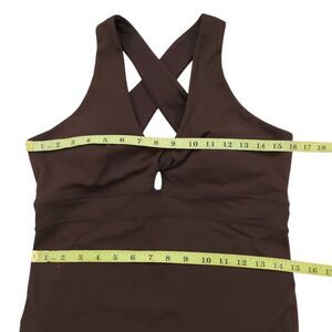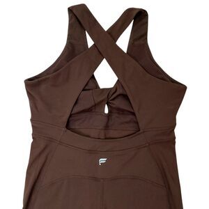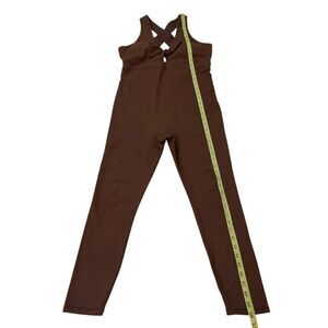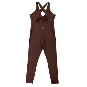 Sleek brown jumpsuit with crisscross back. Perfect for active wear.