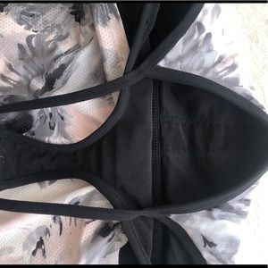 White- black bra. Has a gray, light pink floral print. Same print in mesh on the back. These shirts are great for running or even yoga. The toggle waistband keeps it in place. Super breathable and lite weight.