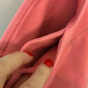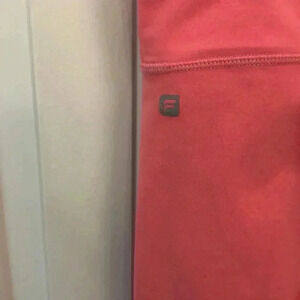 Pink Fabletics carpri cropped legging. Mid-waist. All way stretch, hidden pocket. About 23” long, 12” Waist. I am 5’4” and lands about mid calf. It is light coral/pink in color