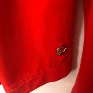 Fabletics Carla cut out off-shoulder top in red-orange. Long raglan sleeves. Stretch. Side tie. Can be worn as a regular top or as an off-shoulder top. Metal logo on bottom left side. Gently used. No visible flaws. 95% rayon/5% elastane. Machine wash.