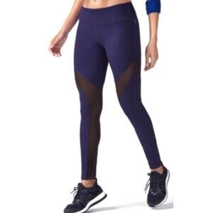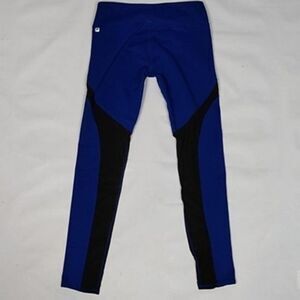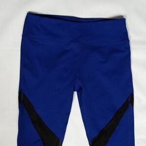 Blue midrise leggings with black mesh detail. Excellent condition. Leggings measure 14" across top of waist band, 29" inseam and 9" rise.