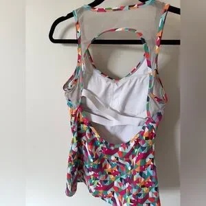 Bold geometric print. Racerback style. Ideal for active wear. Built-in bra. There is a slight inconsistency on the front (pictured). Top sheer/lace is gray.