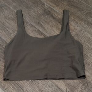 Has a built in shelf bra but no padding. square neckline, cropped. this is the Lydia built in bra crop top in color Grizzly. Used good condition, no rips or stains.