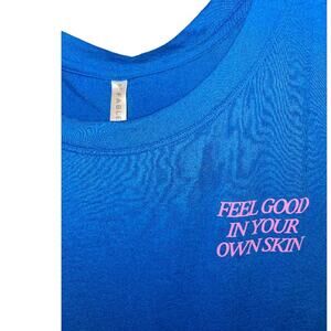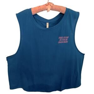 Fabletics Cropped Feel Good...Mantra Muscle Tank Electric Blue with pink "Feel Good In Your Own Skin" on the left.