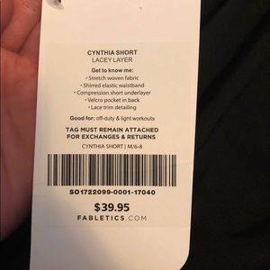 Fabletics running shorts. Has a lace detail on the side and spandex underneath. NWT. Non-smoking home.