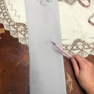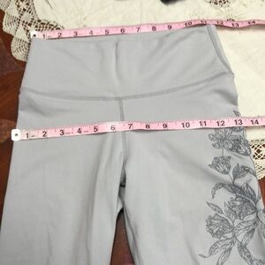 Light dove gray high waisted full length leggings with floral embroidery. There is some barely visible discoloring on one knee that is not noticeable when worn.