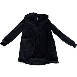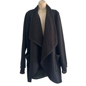 Fabletics Eugenia Coat in black. Coat is a bit oversize and has an open draped front. The bottom has mesh detailing and so do the cuffs. Cuffs also have thumb holes. Coat is made of a poly viscose blend (fabric tag has been removed) and is a woman's size large.
