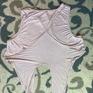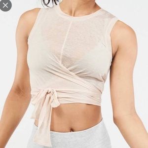 Light pink, soft & stretchy Fabletics shirt with waist ties. The shirt is definitely pretty cropped and has and open-back wing design. I included two pictures of the closest Fabletics shirts I could find.