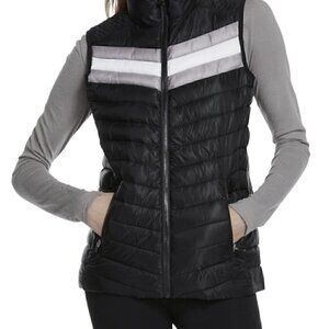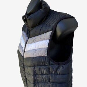 Stylish, athletic, lightweight black puffa quilted Fenway Vest by Fabletics. Gray & white stripes on top front chest. Side zipped pockets. No material or washing instructions tags.