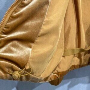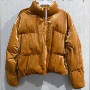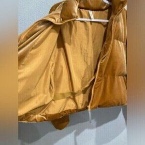 Stylish gold puffer jacket. Velvet/velour. Soft and comfortable. Perfect for layering.