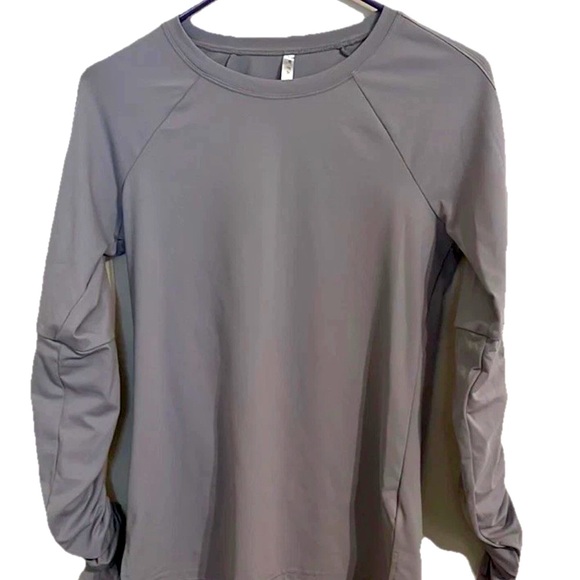 This stylish gray sweatshirt from Fabletics features a ruched design and raglan sleeves, offering both comfort and a modern look. The long sleeves and soft fabric make it ideal for cooler weather, while the relaxed fit ensures ease of movement.