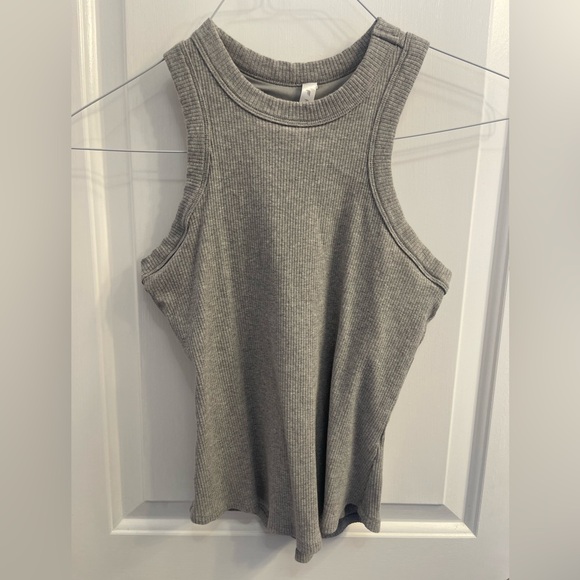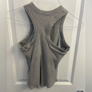 Chic gray racerback top by Fabletics. Perfect for workouts and casual wear. Built in shelf bra.