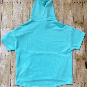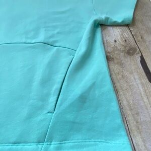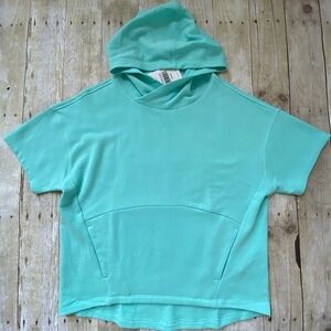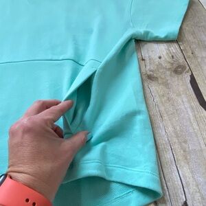Super cute fabletics hoodie. Soft terry fabric. Hidden pocket. Relaxed fit. Cropped front, longer back. Women size small (size 4-6). The color isn’t picking up great in my photos but it’s a mint green