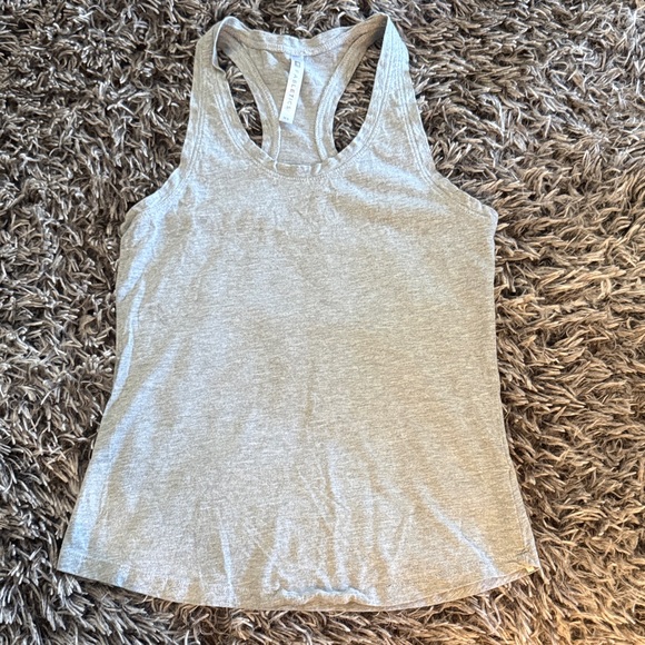 Lightweight athletic tank with subtle heather texture. Racerback silhouette for mobility. Soft, breathable fabric. Simple branded tag detail.