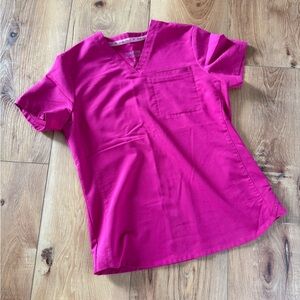 Vibrant hibiscus pink scrub top with one chest pocket - size small. Semi-slim fit for comfort. Matching joggers - size XS.