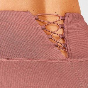 Fablietics Leggings. Color: Cherry Mocha (Pink). Ribbed Texture. Seamless. Pull on Style. Lace Up Back Waist. Chafe-Resistant. Moisture-Wicking. NWT. 62% Nylon/30% Polyester/8% Elastane. Size Large. Flat Lay Measurements: Waist 14" Rise 10" Inseam 26"