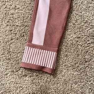 These are a muted pastel red with light pink vertical stripes. They are extremely stretchy and comfy. Seamless. Size small Ribbed texture on the sides and ankles.NWOT, never worn