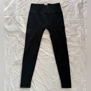 Black high-waisted leggings featuring a lace-up detail on the back. Perfect for casual wear or workouts.
