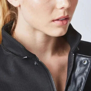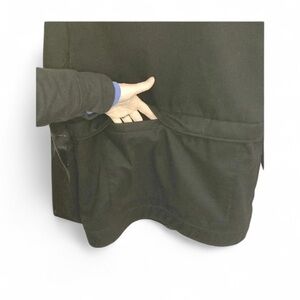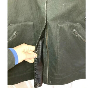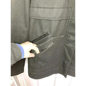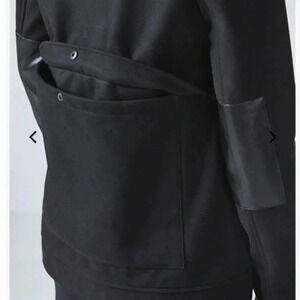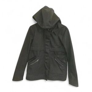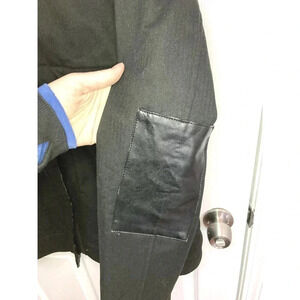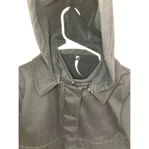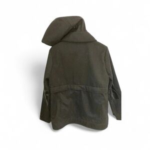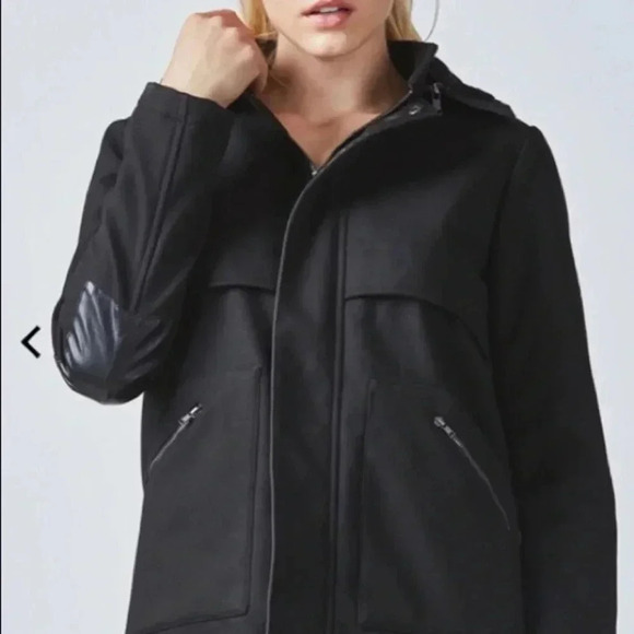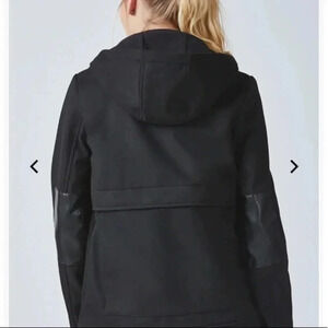Convertible jacket that goes from pea coat to hooded jacket of your dreams. Pleather on the elbows and on the inside flap where the buttons down the front. Buttons and zips down the front. Hood is removable. Fits true to size.