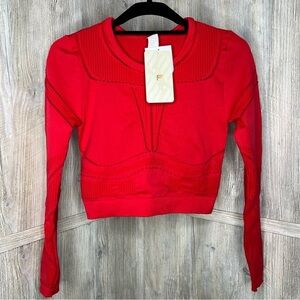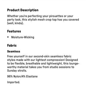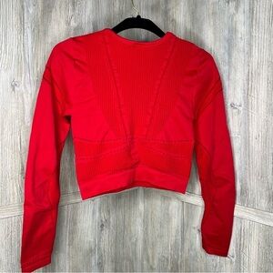 Long Sleeve Fitted Seamless Workout Top. Cropped Cut Mesh Cutouts. Moisture Wicking. Approx measurements pit to pit 14.5”, Length from Shoulder to Bottom 16.5”. NWT🚭