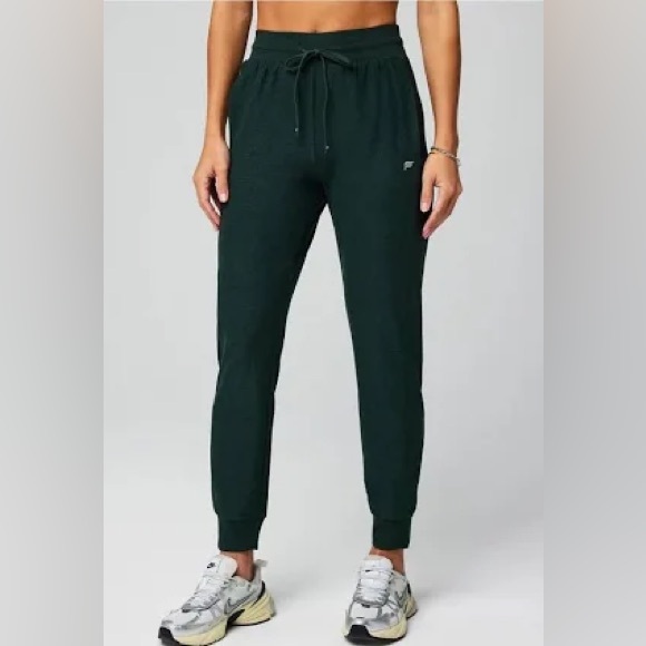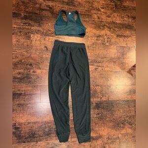 Fabletics dark green jogger pants and sports bra. Comfortable and versatile.