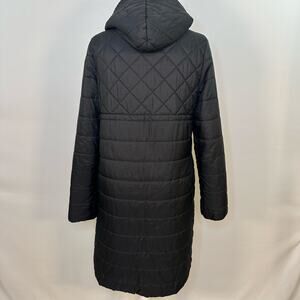 Fabletics Knee Length Hooded Puffer Jacket Black. 100% polyester. Full zip and snap front. Two front pockets and one inner pocket. Womens size Medium. Good used condition.