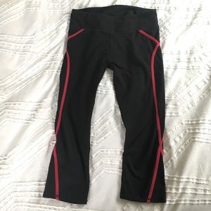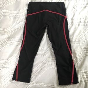 Great leggings for working out or hanging out • red curved line along sides and upper bottom • very flattering • 5 way stretch • some wear, good condition • portion of stitching on right leg is coming off (decorative does not change function)