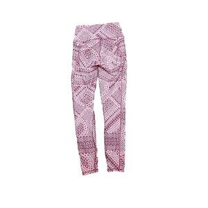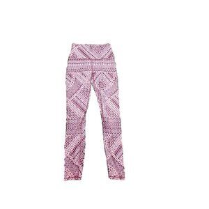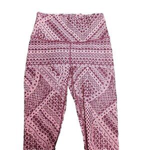 Fabletics Women's Mid-rise Maroon/Pink Design Leggings in XS are perfect for activewear and casual occasions. Made of polyester and spandex, these leggings have a rope design and a pull-on closure. They feature compression areas for the thigh, waist, leg, and abdomen, and have an athletic fit. The leggings have pockets, moisture-wicking, UV protection, and stretch features. They are machine washable and have a 26-inch inseam. These cropped leggings are suitable for winter, summer, fall, and spring, and are ideal for gym & training, track & field, cross-training, CrossFit, typing, and yoga.