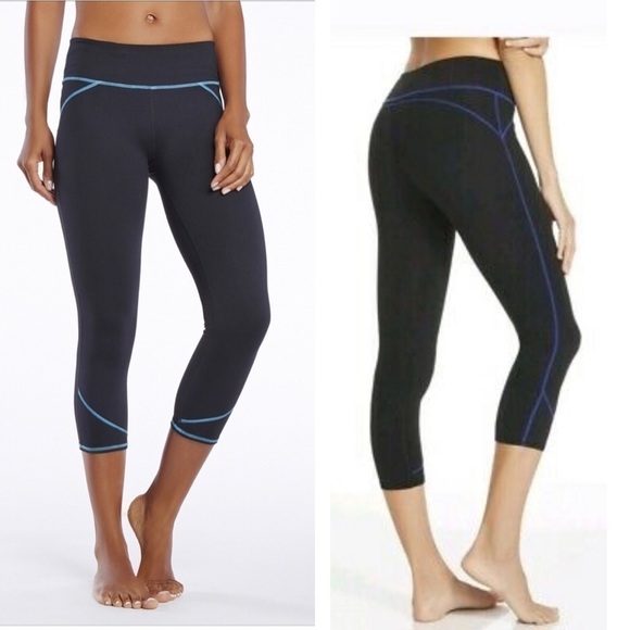 Fabletics Lima Capri style 393080-47 in black with blue stitching. Leggings are capri length with vibrant blue piping around hips and cuffs. Fabric content is 88% polyester and 12% elastine. Machine wash, tumble dry. Excellent pre-owned condition; size XS.