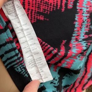 This Fabletics romper in the heat wave print has a fun teal, coral, and black modern design with mesh details, a concealed back zip, flattering elastic waist, and front pockets. Multi-strap design and lightweight fabric. A soft, silky, wrinkle-resistant romper for the warmer months in a bold design! Good preloved condition with signs of wear. Size small. elastic waist - stretchy waist