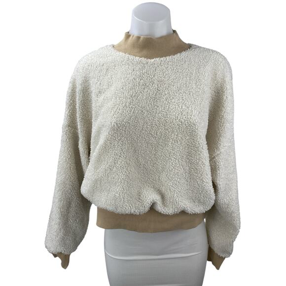 Fabletics Malia Polar Fleece White Brown Mock Neck Long Sleeve Sweater Top Size M
