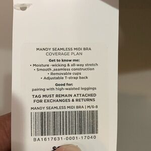 New with tags. Moisture wicking all the way. Stretch midi bra. Removable cups. Adjustable tea strap back. Smooth seamless construction. Size medium. Black. Good for pairing with high waisted leggings.