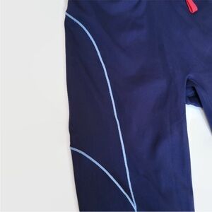 Fabletics Motion 365 High Waisted Navy Blue Panelled Leggings. Seamless front for a smoother polished look. Fully adjustable waistband with an exterior red drawcord. Hidden back exterior pocket and a small interior pocket. Contrasting decorative stitching in baby blue, creates a flattering shape. Chafe resistant and moisture wicking.