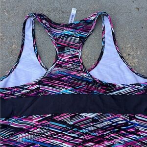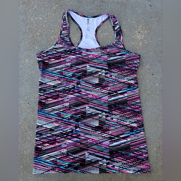 Vibrant racerback tank with multicolor pattern. Perfect for active wear.