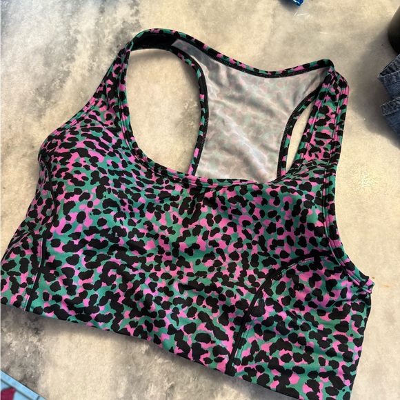 Vibrant sports bra with a stylish pattern. Racerback design for comfort. Ideal for workouts. New without tags