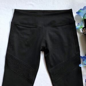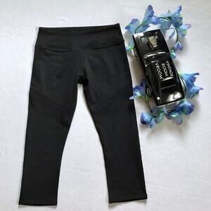 NWOT. Performance Capri for Women Size S. Black, pull on, ribbed top half sides and knees, hidden internal pocket shown in pic. Please note there are no internal brand/material/care tags, but there is the brand logo back top left side shown in pic. I am approximating is a Size S based on measurements, please see measurements for best sizing. Pictures are part of description.
