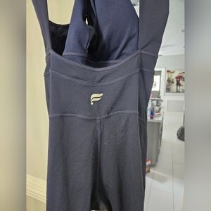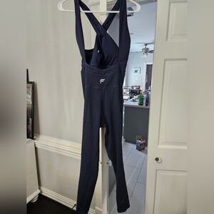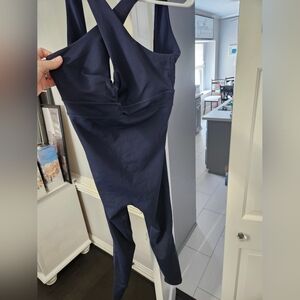 Sleek navy jumpsuit. Sleeveless design. Perfect for active wear.